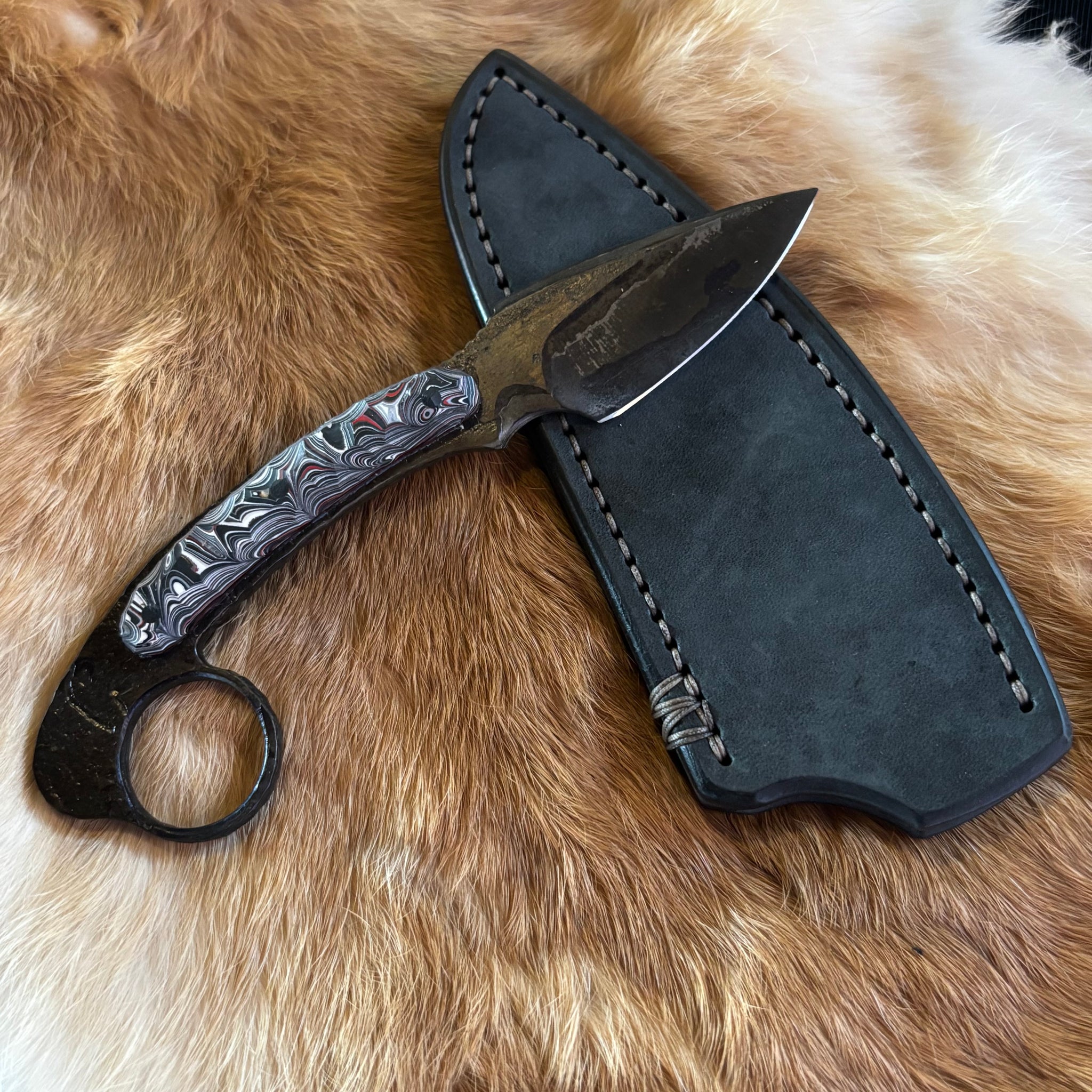 A low layer Damascus hunters scalpel wearing some wicked fordite scales.