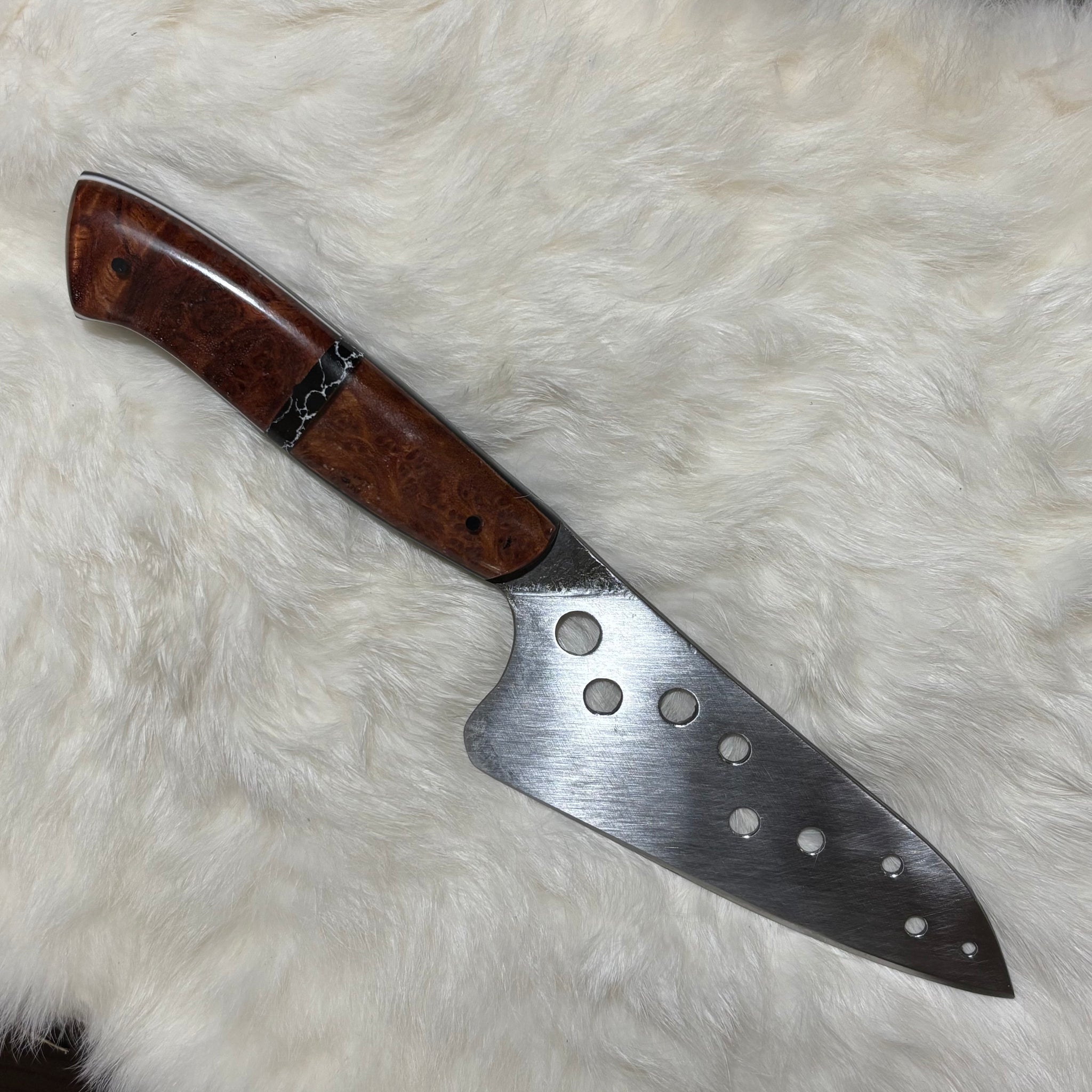 This smaller petty chef has laminated cast amboyna scales and a post modern look